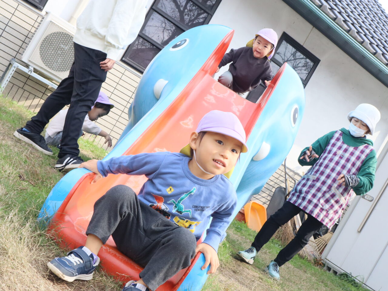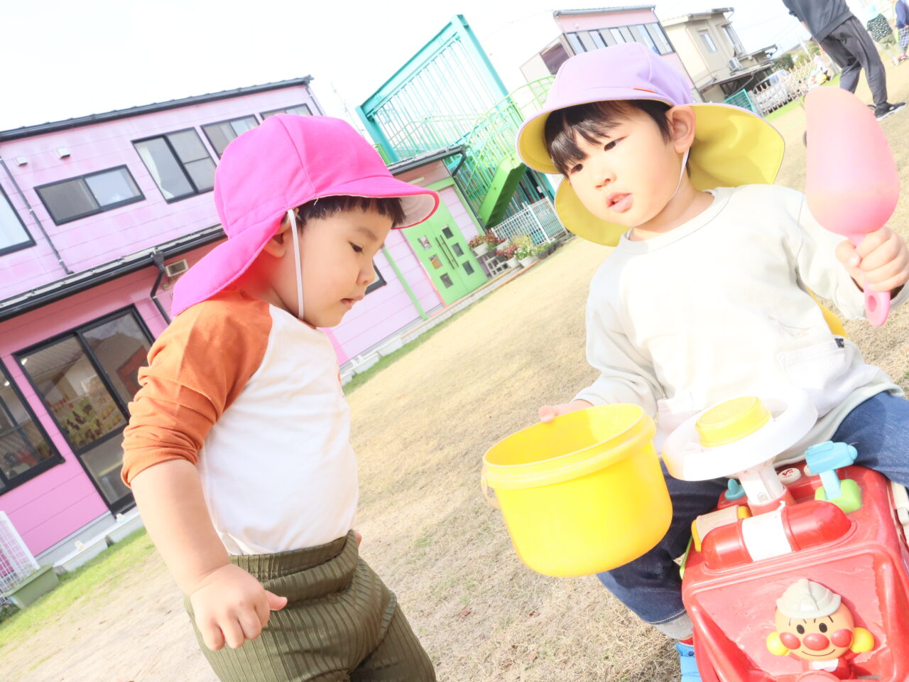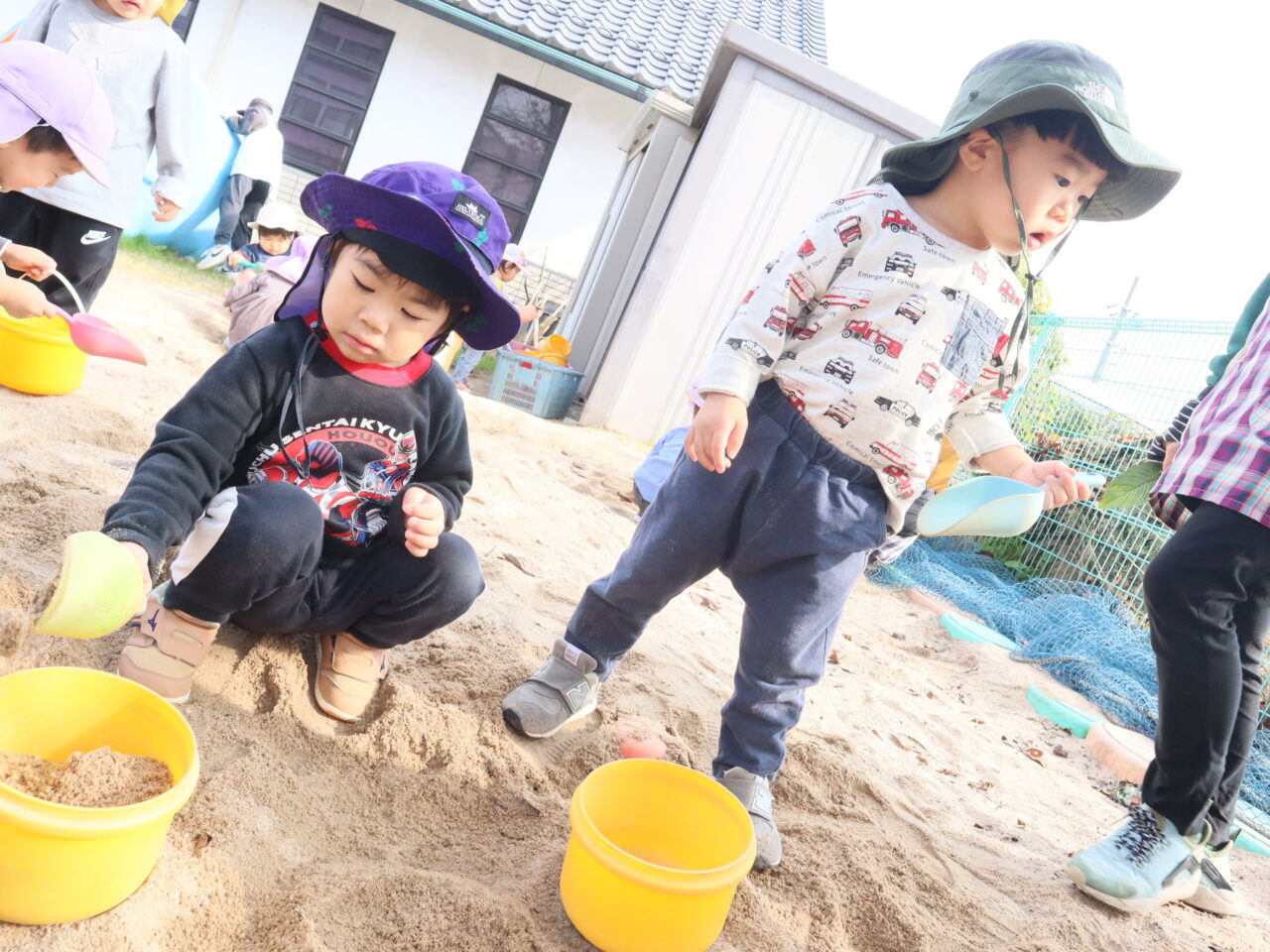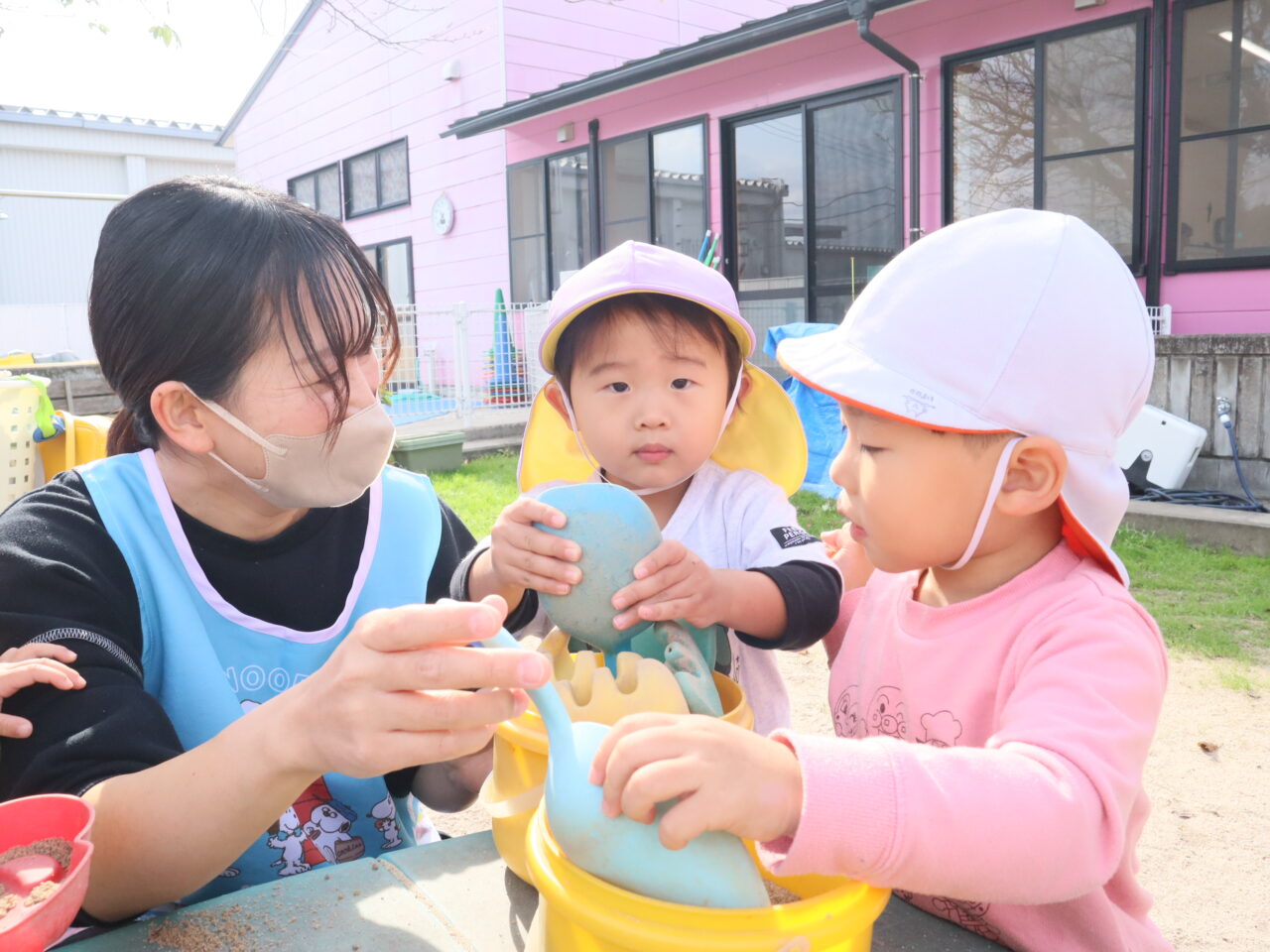 聖テレジアこども園の未満児組のお友達は、砂場でケーキ作りを楽しんだり桜の木に隠れている”カエル”を見つけたりして、元気いっぱい戸外遊びを楽しみました。