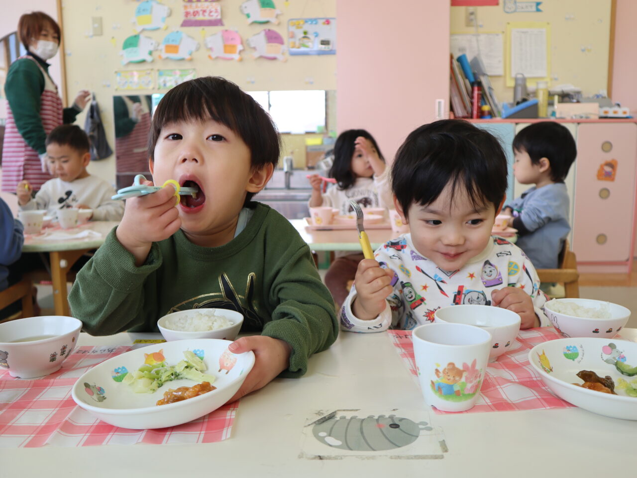 0.1歳児クラスはホールで体を動かし、元気に遊びました。給食もよく食べ、モリモリとおいしそうに食べる姿が見られました。